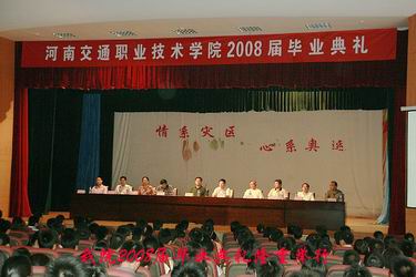 6月30日下午3时,河南交通职业技术学院艺术报告厅气氛热烈,乐声悠扬,学院2008届毕业典礼暨优秀毕业生表彰大会在这里隆重举行。院党委书记王庆,院长李亚杰,党委副书记伊国文,副院长任卫平、王杰亭,纪委书记夏青,调研员张浩、助理调研员董长拴,院长助理毛新年、解福泉在主席台就座,学院各系部学生工作人员、毕业班辅导员以及2008届毕业生代表参加了毕业典礼。