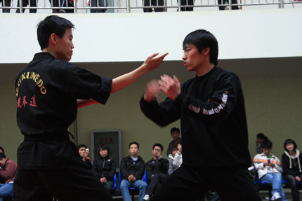 武术表演在一阵动感的音乐中拉开序幕,一套精彩的长拳过后,只见一名小伙子带着长剑跃上舞台,手中舞动的长剑像条银链在空中穿梭,传来呼呼风声,他的剑法颇具功底,表演更是柔中带刚,洒脱流畅的表演不时引来台下阵阵尖叫。接下来武术协会的同学们又分别展示了勾漏手、寸劲拳、双节棍等精彩的武术招式,为了方便观众理解,还特别邀请了院广播站的同学现场解说。表演中,演员们一招一式追求精益求精,尽显铮铮男儿铁骨本色,不时赢得在场观众的热烈掌声。