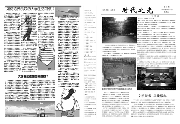 经过为期一个多月的精心准备,交通信息工程系文学社于12月12日正式创办了第一份属于自己的报刊――《时代之光》。