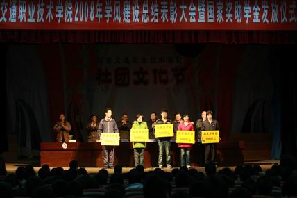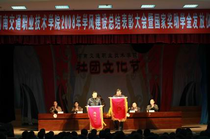 副院长夏连学宣读了《河南省教育厅、共青团河南省委员会关于表彰2008年河南省普通高等学校三好学生、优秀学生干部和先进班集体的决定》、《河南交通职业技术学院关于表彰2008年学风建设先进集体和先进个人的决定》和《河南交通职业技术学院关于确定2007-2008学年度国家奖助学金学生名单的通知》,与会领导为获得奖励的学风建设先进系部、先进班级、先进个人颁发了锦旗和证书。