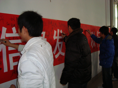 签名仪式上,同学们首先举行诚信宣誓:抵制抄袭作弊,诚信做人、诚信做事,做一个诚实守信的大学生。接下来同学们郑重地在“让诚信焕发活力,用行动诠释人格”的条幅上签上了自己的名字。并纷纷表示,要积极响应院系号召,认真学习,诚实考试,力争以优异成绩为08 �09学年第一学期画上圆满的句号。