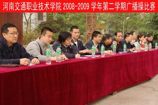 4月25日,我院2008-2009第二学期学生广播操比赛在南校区文化广场举行。全院20多个班级近2000名学生参加了比赛。副院长王杰亭,院长助理、学生工作处处长毛新年,团委书记熊瑛,学生工作处副处长张震,各系党总支书记,体育教研室老师出席比赛并担任评委。各系学生工作办公室负责人、辅导员及南校区同学观看了比赛。