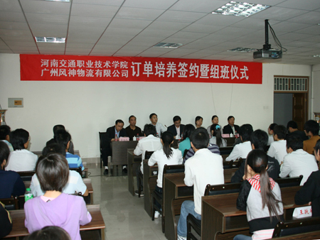 双方领导签订了《广州风神物流有限公司河南交通职业技术学院订单培养协议书》并举行授牌仪式。风神物流自合同签订起每年将选拔50名物流管理相关专业在校生进入订单班,进行专业培训,并在合格毕业后由甲方录用安排就业,双方还将在订单合作的基础上进行学术交流与专业共建。王宏伟总经理在讲话中对选拔出的首批订单班学生质量给予了高度评价,指出“风神物流订单班”将实现公司、校方与学生的三方共赢。