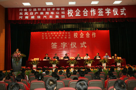 河南交通职业技术学院与东风日产、河南威佳签订校企合作协议后,将首先开办东风日产订单培养班。东风日产与河南威佳为学院提供可供培训的车辆及配件,学院提供培训场地、通用工具及师资等,共同培养汽车后服务市场需要的人才,河南威佳对于订单内的合格学员全部安排就业。三方还将定期进行学术交流,东风日产将安排讲师为学院教师进行培训,培训后的教师服务于“东风日产班”,威佳对培训提供支持。