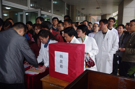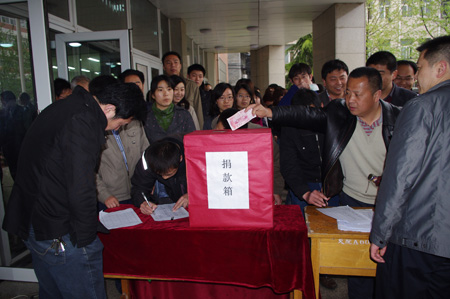 捐款现场,虽然下着雨,但教职工仍然排起长龙,慷慨解囊,争相捐助,处处涌动着一片浓浓真情。院领导和教职工的这一义举,深深影响和感召了全院所有人员,承包学院餐厅的经理和服务员、卫生所聘用的医护人员、学院的保洁员、保安也都纷纷来到现场,自发的为灾区人民奉献一份爱心。截止到下午6点,全院共捐款两万余元。