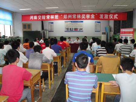 我院“郑州常林奖学金”是郑州常林贸易有限公司为鼓励我院“常林班”学员投身工程机械行业而设置的专项奖学金, 该项奖学金每年评选一次,每次奖金总额为10000元,今年是第二次颁发奖学金。根据常林班学员2009年的综合表现,晋大挥、王震东等5名同学喜获一等奖,每人奖金1000元,冯东华、李湘等10名同学分获二等奖,每人奖金500元。