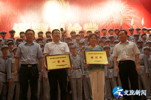 (院领导为获奖部门颁奖) 为庆祝中国共产党成立90周年,歌颂党的丰功伟绩,弘扬党的优良传统和作风,展示我院师生昂扬向上、团结一心的精神风貌,促进创先争优活动的深入开展。6月1日下午,学院在艺术中心隆重举行庆祝中国共产党成立90周年歌咏比赛。 比赛前学院党委书记徐强发表了热情洋溢的讲话。河南省交通运输厅领导霍金花、王晓共、马健、曹焱、张丽、许建军等与学院领导徐强、李亚杰、张浩、夏连学、夏青、华志坚、毛新年、张瑞春等一同亲临现场观看比赛并为获奖单位颁奖, 比赛以学院离退休老同志合唱队一曲满怀深情的《我和我的祖国》拉开序幕,各参赛队以高昂的激情和别具一格的表演充分展现了各自的精神风貌和艺术风采,他们以动听的歌声,优美的旋律抒发了对党对祖国的无限热爱之情,表达了对红色历史的缅怀,及对未来的美好憧憬,博得在场观众的阵阵掌声。 本次歌咏比赛共有十三个代表队参赛,师生同台演出,经过紧张的角逐,经济管理系学生代表队荣获一等奖,机关联队、总务处代表队荣获二等奖,交通信息工程系学生代表队、人文社科系教师代表队及学生代表队荣获三等奖,汽车工程系教师代表队等荣获优秀组织奖,离退休老同志代表队荣获特别奖。