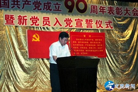 6月28日下午,我院庆祝中国共产党成立90周年表彰大会暨新党员入党宣誓仪式在艺术中心报告厅隆重召开。学院领导徐强、李亚杰、张浩、夏连学、夏青、贺绍华、解福泉、毛新年等一起出席了大会。全院400余名教职工、学生党员、入党积极分子代表共同参加了大会。大会由学院副院长毛新年主持。