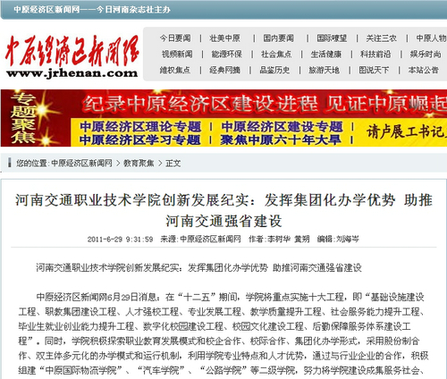 作为河南省交通运输职业教育集团的理事长单位和秘书长单位,河南交通职业技术学院在各理事单位的大力支持配合下,始终坚持“政府主导、行业指导、校企合作、广泛参与”的职业教育发展方针,一直致力于职教集团的发展,2011年来更是从中原经济区建设和交通运输事业跨越式发展的实际需要出发,以交通运输职业院校和行业企业、科研院所为主体,校企、校际合作办学、合作育人、合作就业、合作发展,实现人才共育、过程共管、成果共享、责任共担、发展共赢,全面提升交通运输行业教育培训能力,为经济社会和行业企业发展提供人才智力保障,而这一切正是河南交通职业技术学院创新职业化教育模式,坚持走校企合作办学、集团化办学道路的一个精彩展现。