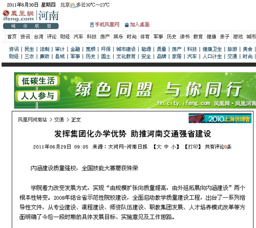 2011年6月22日,河南交通职业技术学院内彩旗招展、繁花似锦、生机盎然。河南省交通运输职业教育集团2011年理事大会经过精心筹备在此隆重召开,省教育厅、省交通运输厅相关与会领导高度肯定了河南省交通运输职业教育集团和学院的工作,认为河南省交通运输职业教育集团自成立以来,不断创新体制机制,深化校企校际合作,已初步形成了主管部门重视、企业参与积极、校企结合紧密的良好发展格局,学院及交通职教集团的创新发展符合职业教育的规律,符合河南的省情,符合经济社会发展的要求,河南交院在探索职业教育集团化办学,推进教育体制机制创新和人才培养模式改革等方面,发挥了积极的引领作用。