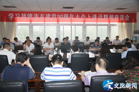 7月4日学院召开学习胡锦涛总书记在庆祝建党90周年大会上重要讲话精神座谈会。学院领导徐强、李亚杰、张浩、夏连学、贺绍华、解福泉、毛新年、张瑞春等出席会议,全院副科级以上干部参加会议。院党委书记徐强发表重要讲话,就认真学习、贯彻落实胡锦涛总书记重要讲话精神,在党的领导下进一步推进学院各项工作的创新发展提出了明确要求。