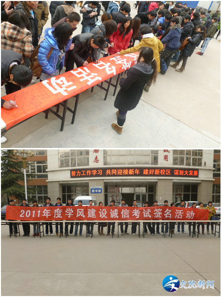 为加强全校学风建设,引导广大同学端正考试态度,倡导良好考风,严肃考场纪律,自觉遵守考试的各项规章制度。12月21-22日,由学工处主办,院外联部和院宿管部承办的学风建设月“诚信考试签名活动”分别在南北校区拉开序幕。
