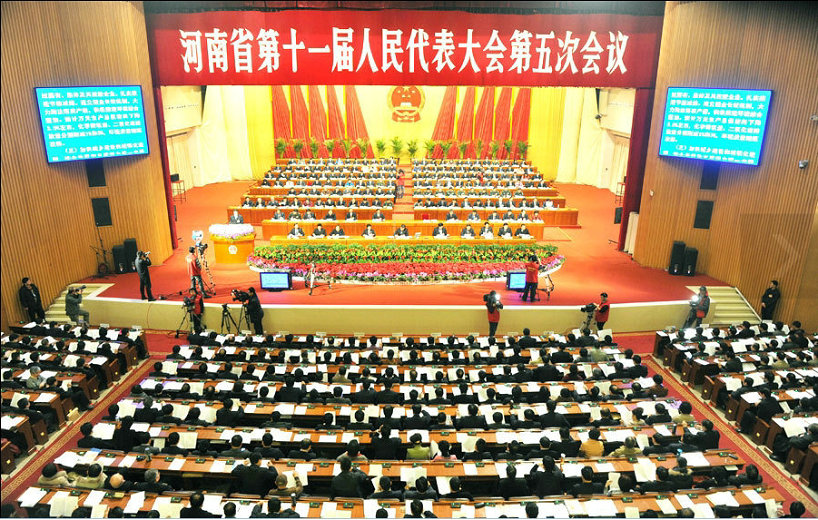 1月8日上午,河南省第十一届人民代表大会第五次会议在省人民会堂隆重开幕。 上午9时,大会主席团常务主席卢展工宣布:河南省第十一届人民代表大会共有代表951名,出席开幕大会的代表902人,符合法定人数,现在大会正式开幕。 与会人员全体起立,会堂内响起雄壮的国歌声。 在热烈的掌声中,省长郭庚茂作《政府工作报告》。 图为会议现场 。