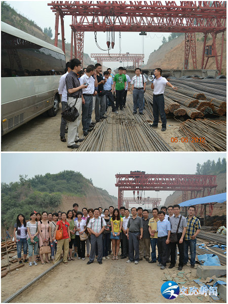 在巩登高速一标段,新教师们实地参观了箱梁模板制作、混泥土浇筑、箱梁架设等高速公路中桥梁施工环节和施工过程,并与施工人员就学生实践能力培养进行了深入交流。