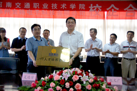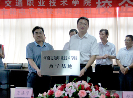 签字仪式由张瑞春副院长主持,夏连学副院长为签字仪式致辞并为郑州金路电子科技有限公司授“教学基地”牌匾。赵文广总经理对“金路集团IT人才培养基地”进行了授牌,并对我院的教学环境和学生素质进行了高度评价。