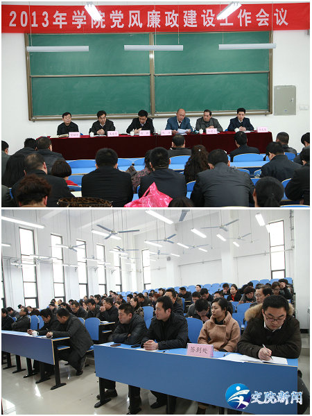 3月6日下午,学院在新校区召开2013年学院党风廉政建设工作会议。大会由院党委书记徐强同志主持,院领导、中层副职以上干部、正高职教师,机关及新校区建设指挥部全体人员参加了会议。