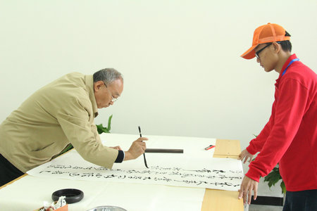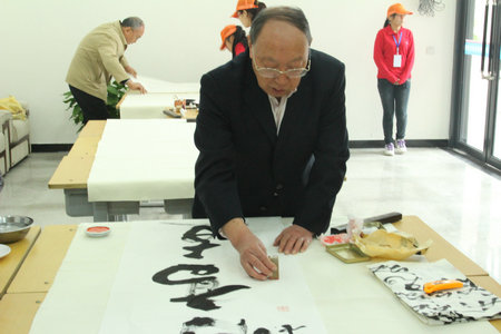 11月5日下午,学院举办了庆六十华诞书画家笔会。省文联副巡视员、省书法家协会副主席张剑锋,省书画学会副主席、河南报业集团编委委员韩嘉俊,82级校友、洛阳市交通运输局长赵震,中国书画艺术研究院副院长郑金玉,河南省书法家协会会员、学院退休老干部朱登宪等著名书画家十余人和广大师生及书画爱好者参加了笔会。