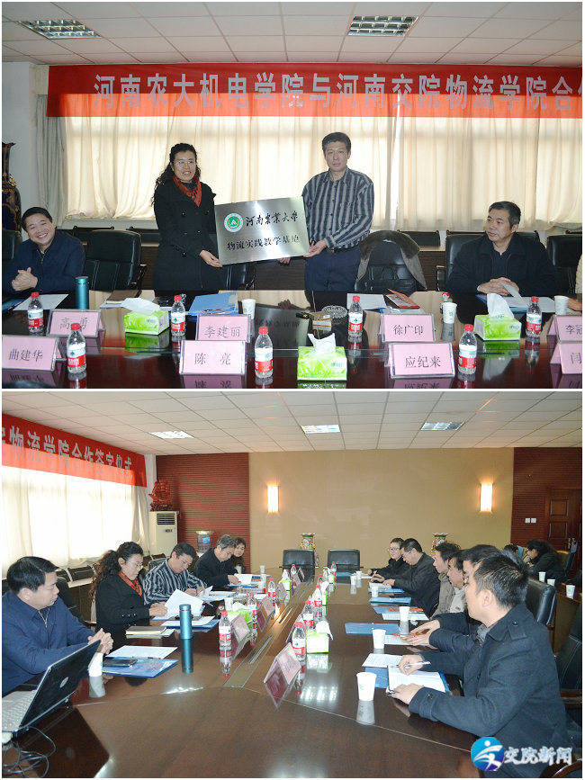 12月27日上午,我院物流学院与河南农业大学机电学院在航海路行政楼会议室举行合作签字仪式,河南农大机电学院院长徐广印教授等一行六人出席此次仪式。签字仪式由物流学院党总支高勇书记主持,物流学院院长李建丽、相关专业老师参加了此次签字仪式。