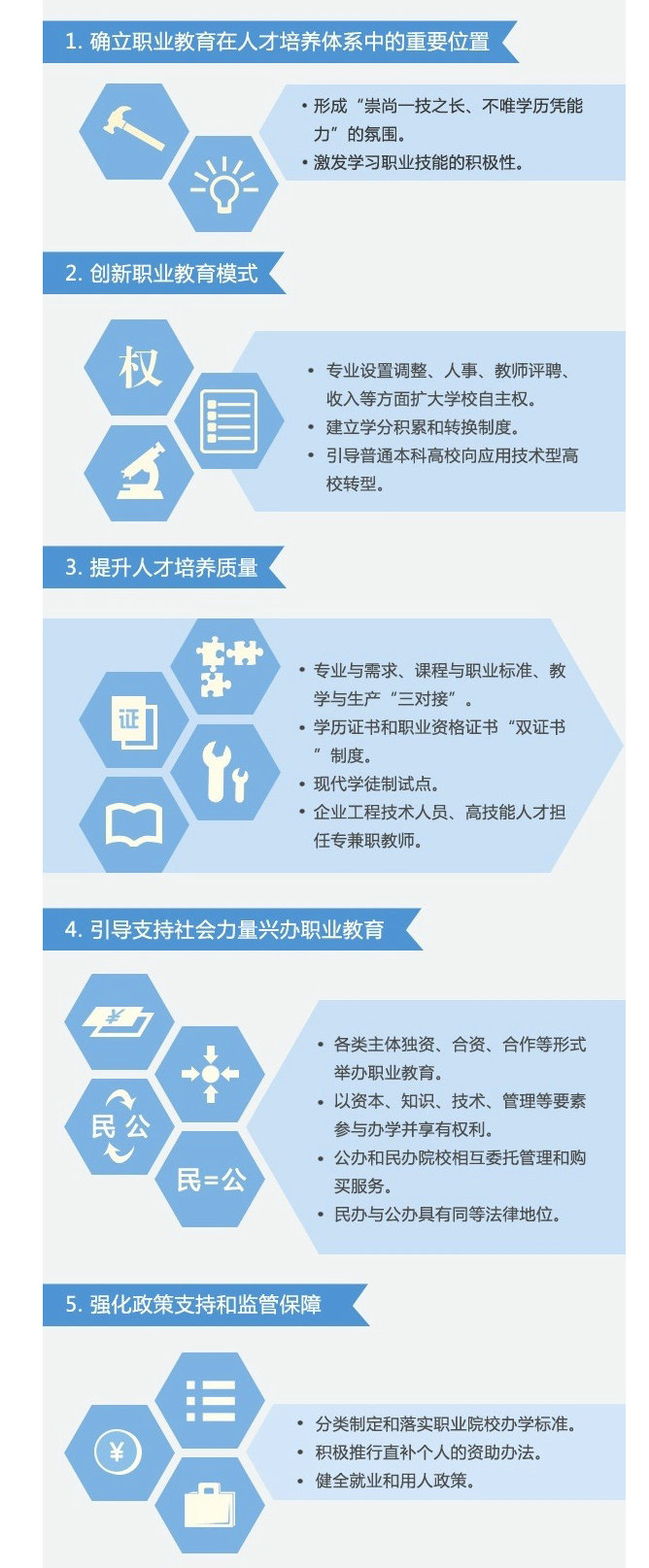 会议确定了加快发展现代职业教育的任务措施。一是牢固确立职业教育在国家人才培养体系中的重要位置,促进形成“崇尚一技之长、不唯学历凭能力”的社会氛围,激发年轻人学习职业技能的积极性。二是创新职业教育模式,扩大职业院校在专业设置和调整、人事管理、教师评聘、收入分配等方面的办学自主权。建立学分积累和转换制度,打通从中职、专科、本科到研究生的上升通道。引导一批普通本科高校向应用技术型高校转型。三是提升人才培养质量。大力推动专业设置与产业需求、课程内容与职业标准、教学过程与生产过程“三对接”,积极推进学历证书和职业资格证书“双证书”制度,做到学以致用。开展校企联合招生、联合培养的现代学徒制试点,鼓励中外合作。完善企业工程技术人员、高技能人才到职业院校担任专兼职教师的政策。四是引导支持社会力量兴办职业教育。积极支持各类办学主体通过独资、合资、合作等形式举办民办职业教育;探索发展股份制、混合所有制职业院校,允许以资本、知识、技术、管理等要素参与办学并享有相应权利。探索公办和社会力量举办的职业院校相互委托管理和购买服务的机制。社会力量举办的职业院校与公办职业院校具有同等法律地位。推动公办和民办职业教育共同发展。五是强化政策支持和监管保障。各级政府要完善财政投入机制,分类制定和落实职业院校办学标准,加强督导评估。加大对农村和贫困地区职业教育支持力度,完善资助政策,积极推行直补个人的资助办法。健全就业和用人政策。让职业教育为国家和社会源源不断地创造人才红利。