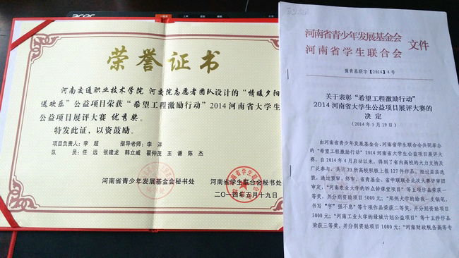 近日,我院志愿者团队荣获“希望工程激励行动”2014年河南省大学生公益项目展评大赛优秀奖。