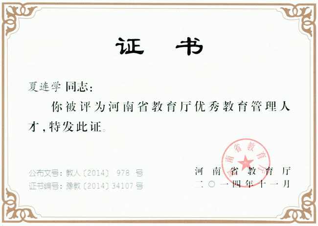 近日,河南省教育厅下发了《关于公布河南省教育厅优秀教育管理人才评选结果的通知》,我院夏连学同志被评为河南省教育厅优秀教育管理人才。