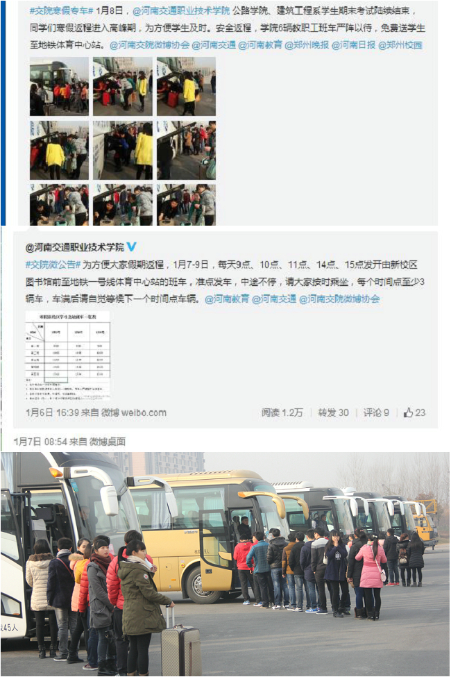 1月初,元旦小长假刚过,全省各个高校学习先后进入期末考试阶段,2015年寒假来临,但是学院新校区位于中牟县附近的刘集镇职教园区,这里远离市区,周边公共交通还不够完善,公交线路、车辆都很少。就在学生都在紧张的复习迎考的时候,关于寒假来临,新校区近8000名学生是否能够安全返程成为学院领导高度重视的问题。因此,为确保学生安全顺利返程,弥补新校区公共交通线路较少的问题,学院决定,充分利用现有教职工班车资源,在学生集中返程的1月7-9日三天,每天开发5个班次的大巴车,免费送学生到郑东新区地铁一号线体育中心站站口,确保在学生返程高峰期,尽量少乘和不乘黑车,确保让每一个学生及时、安全返程。
