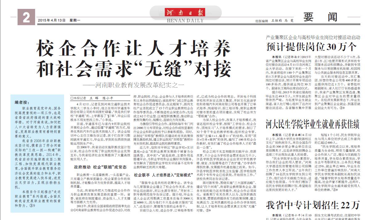 河南日报:校企合作让人才培养和社会需求“无缝”对接——河南职业教育发展改革纪实之一