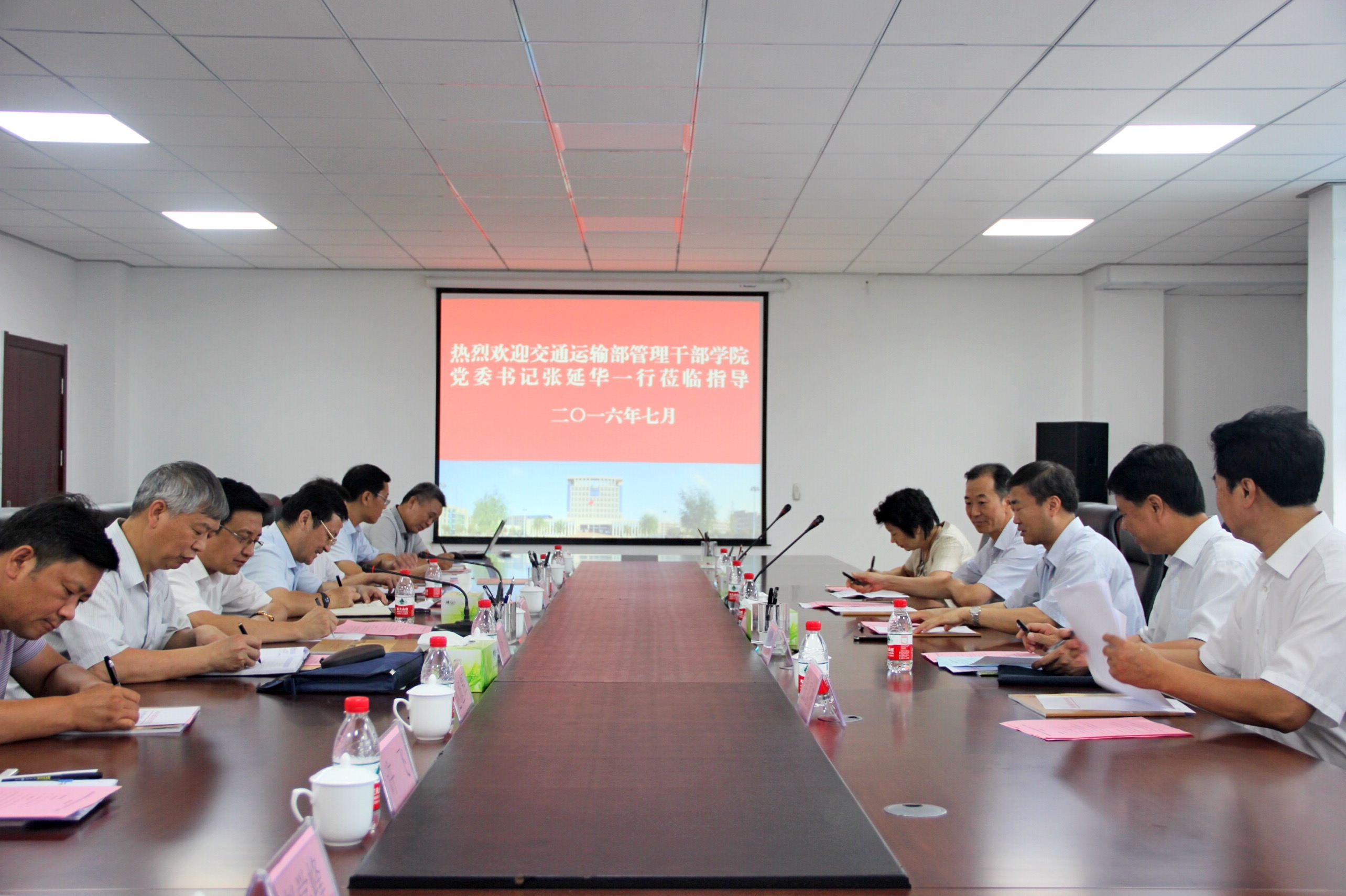 张延华一行首先参观了学院培训公寓、培训餐厅和校史馆,对学院的教育培训条件及校园文化给予充分肯定。在随后召开的调研座谈会上,学院党委书记徐强介绍了学院概况,院长李强汇报了学历教育开展情况及干部网络教育培训平台建设状况,交通技校参会领导也汇报了相关工作开展情况。