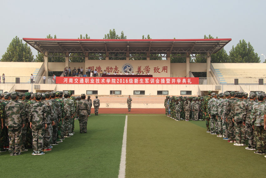 解放军某部国防教育训练中心郭振兴、刘林少校宣读了《河南交通职业技术学院关于表彰2016级新生军训先进个人的决定》。教师代表新生代表分别做了发言。
