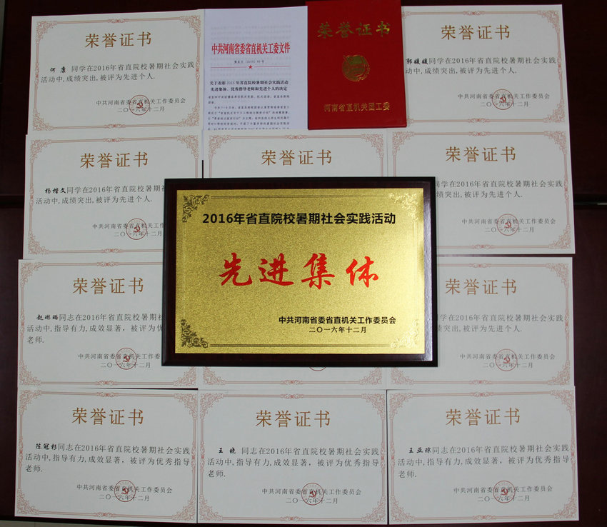 日前,中共河南省委省直机关工作委员会表彰了一批在2016年省直院校暑期社会实践活动中涌现出来的先进集体和个人。在此次表彰中,学院荣获“先进集体”称号,王晓等4位老师荣获“优秀指导教师”称号,何康等7位同学荣获“先进个人”称号。