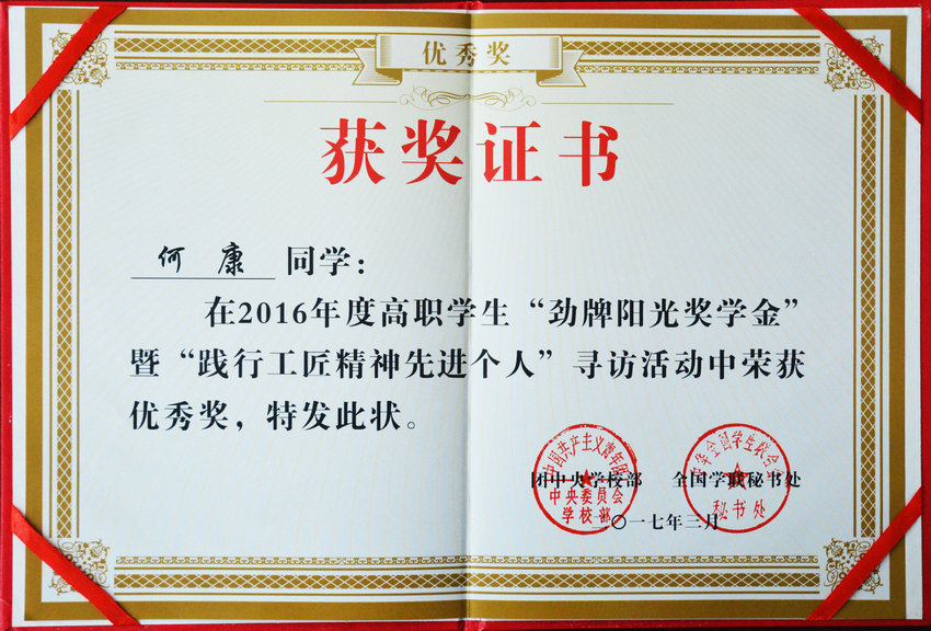日前,由团中央学校部、全国学联秘书处、劲牌有限公司共同举办的2017年度高职学生“劲牌阳光奖学金”暨“践行工匠精神先进个人”寻访活动结果正式揭晓,学院何康同学荣获“劲牌阳光奖学金”优秀奖。