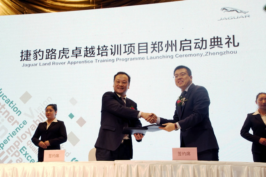 启动典礼在武术《武动中原》中拉开帷幕,捷豹路虎联合市场营销与服务机构技术培训经理郭涛、李强院长、河南省交通运输厅副巡视员宋华东先后致辞。李强院长和郭涛经理分别代表校企双方签订合作办学协议,并为培训中心揭牌,捷豹路虎技术培训经理俞政栋向学院交付新款揽胜实训车钥匙;捷豹路虎卓越培训项目经理张佳陆向捷豹路虎订单班的学徒代表发放IPAD教学设备,全体学徒代表庄重宣誓。随后,领导和嘉宾为新落成的捷豹路虎郑州卓越培训中心剪彩,并饶有兴趣地参观整个培训中心。