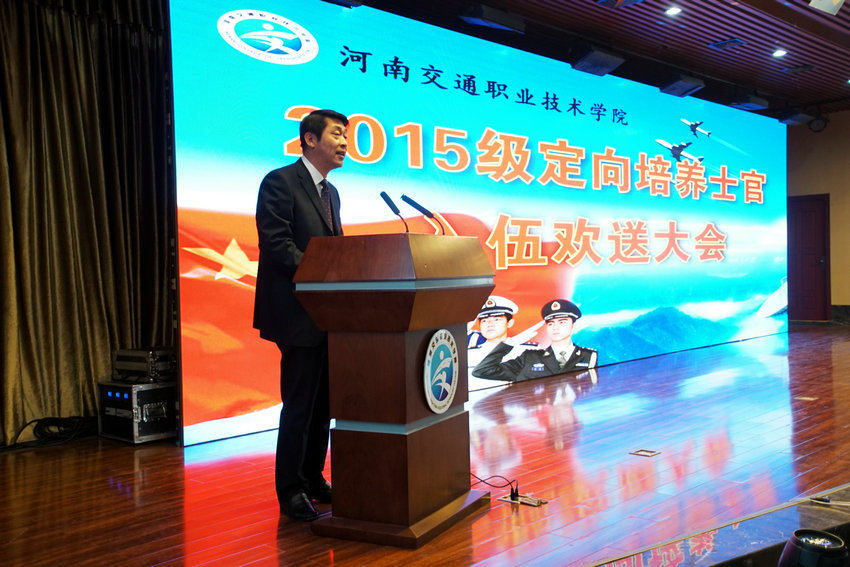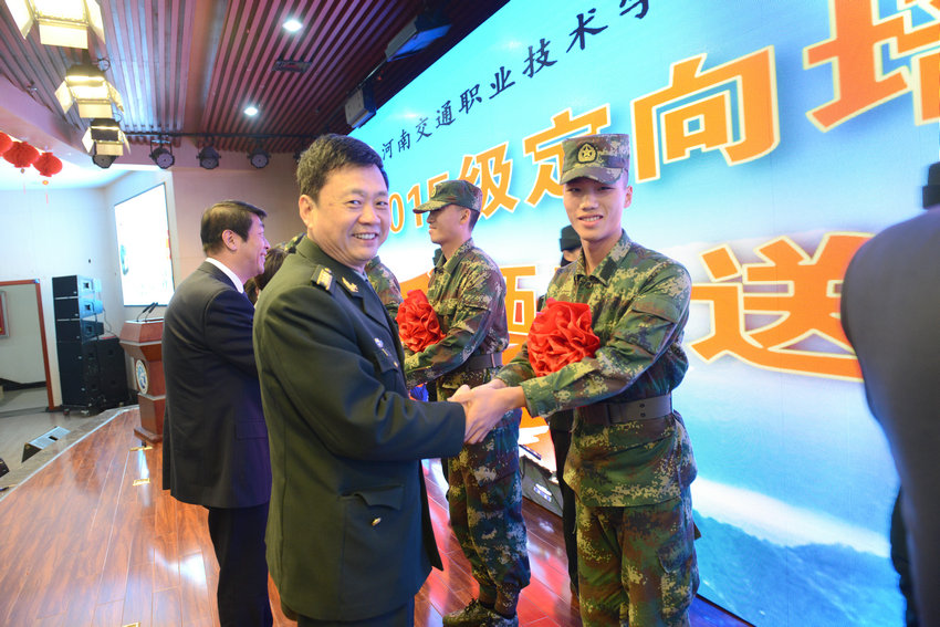 秦剑臣调研员在讲话中对学院服务军民融合发展战略、培养优秀士官的办学行为给予充分肯定。他希望河南交院全面总结定向培养士官生工作的经验,不断深化人才培养模式改革,努力为部队输送更多优秀技能技能人才,为全省高职院校创新发展做出表率。希望各位同学牢记家乡人民的殷切期望,争做有灵魂、有本事、有血性、有品德的新“四有”革命军人,忠实履行好保卫祖国安全和人民和平生活的神圣使命,为实现中华民族伟大复兴的中国梦提供坚强保障。
