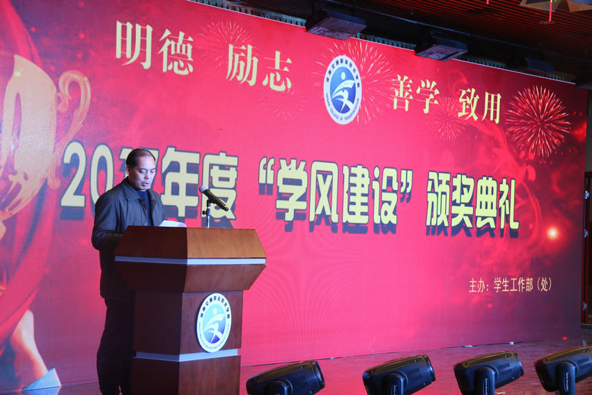 12月27日下午,由学生工作(部)处主办的2017年度学风建设颁奖典礼在新校区图书馆二楼报告厅举行,学院领导曹焱、孙建立、夏连学、张瑞春、卢旺林、李博出席颁奖典礼,全体学生工作人员、各系(院)学生代表参加典礼活动。