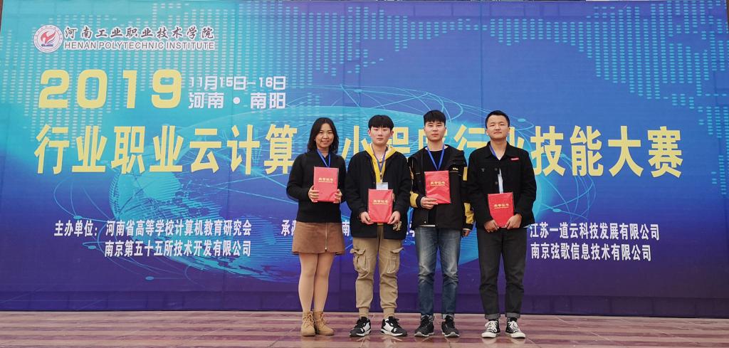 11月15-16日,“2019年行业职业云计算、小程序行业技能大赛” 在河南工业职业技术学院举办。学院交通信息工程系指导教师张真、董真带领蔡奥强、杨增润、高沭庆3名学生参加竞赛,并在比赛中荣获一等奖。