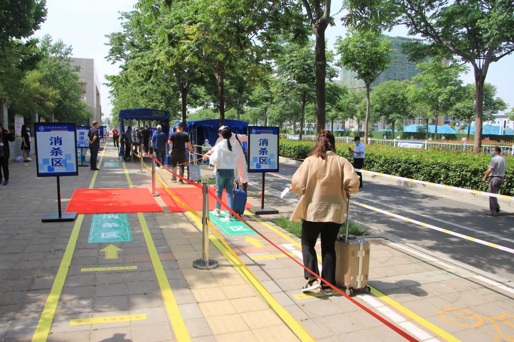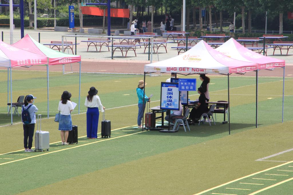 上午10:00,演练开始。学生扮演者手拉拉杆箱从不同方向,分别向学校西门口聚集,入校时,“学生”在工作人员的引导下,按照标线间隔依次排队等待、“学生”经 “身份核验、行李消杀、体温检测、完美校园扫码、手部消毒、更换口罩”等程序后进入学校操场报到区域;在报到区域“学生”接受体温复查、返校报到行程车次时间登记表填写,领取体温温度计、餐厅就餐标识卡及《新型冠状病毒感染的肺炎疫情防控知识宣传及指导防护手册》,完成返校报到;在学生公寓,“学生”经“行李消毒、足底消毒、体温检测”等程序后,进入宿舍;在教学楼,“学生”经过“体温检测”合格进入教学楼,在教室按照规定的位置依次就座,下课依次离开教室;在餐厅,师生经“洗手、手部消毒、人脸识别、体温检测”等程序合格后进入餐厅,在餐厅取餐、落座、就餐、离开均按照规定程序进行;在进入办公楼时,教师按照规定的间隔距离依次排队进入,经人脸识别、体温检测正常后,进入办公室,下班按照规定路线离开办公楼;乘坐班车前,教职工出示健康码、扫描二维码、消毒、按规定位置落座、系好安全带、司机检查乘坐人员系保险带情况。