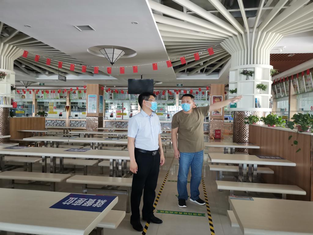 检查中,曹焱、刘志伟分别听取了各有关部门关于学生返校复学工作准备情况的汇报,详细了解学生返校报到流程、防疫物资储备、应急处置演练及食堂、宿舍等处环境卫生保洁、通风消毒等情况。