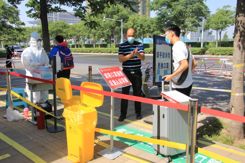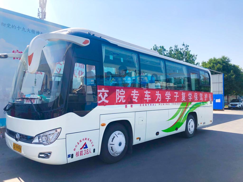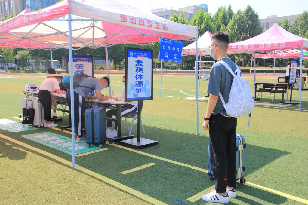 8日早上,悬挂着“交院专车为学子复学保驾护航”鲜红条幅迎接返校学生的专车,便早早来到郑州地铁1号线体育中心站出站口,等候久别校园的学子。“大家辛苦了,欢迎大家返校”,接站老师的一句句真诚的问候,让返校学子倍感亲切,学生们个个脸上洋溢着幸福的笑容。在校门口入口处,拖着行李、戴着口罩的学生按照学校要求,在工作人员的引导下,按照标线间隔依次排队等待、经身份核验、行李消杀、体温检测、完美校园扫码、手部消毒、更换口罩等程序后进入学校操场报到区域;在报到区域经体温复查、返校报到行程车次时间登记表填写,领取体温温度计、餐厅就餐标识卡及领取《新型冠状病毒感染的肺炎疫情防控知识宣传及指导防护手册》等程序后,完成返校报到。进入校园后,学生按照指定路线到达学生公寓,经二次测温和身份核验后进入宿舍。整个流程有条不紊,井然有序。