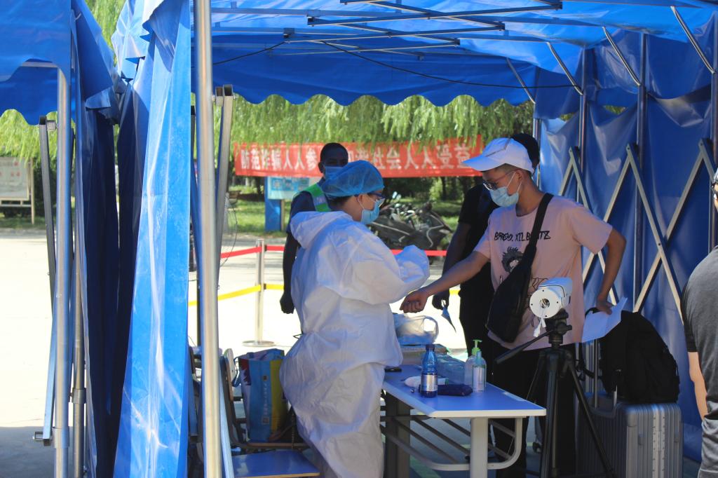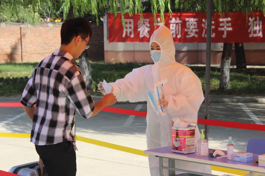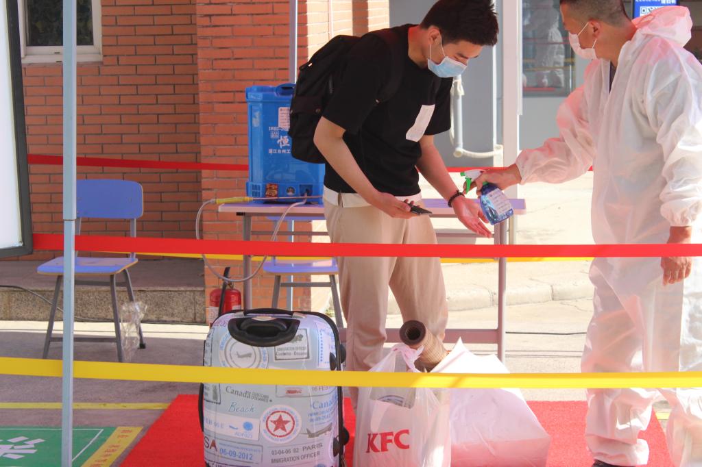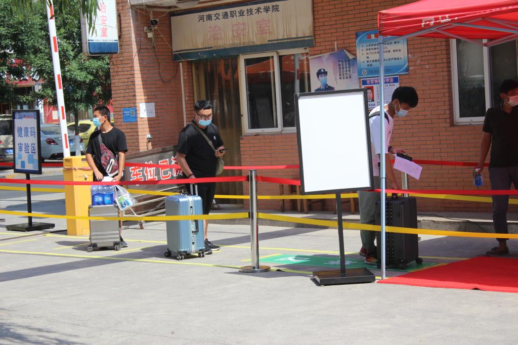 在航海路校区西门返校报到点,报到现场秩序井然,所有工作人员和返校学生全部佩戴口罩,间隔1米以上。在工作人员的指引下,返校学生通过核验健康码、体温检测、消毒杀菌、进校更换口罩、提交返校健康承诺书等流程,完成报到后返回宿舍,整个流程有条不紊,井然有序。