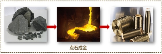 玄武岩纤维是以火山喷发形成的天然玄武岩石为原料,将其破碎后投入熔窑中,加热至1500℃熔融状态,通过铂铑合金拉丝漏板快速拉制形成的纤维,称之为玄武岩纤维。玄武岩纤维为非晶态无机硅酸盐物质。因生产属期短、工艺简洁,没有工业废水、废气、产生,且附加值高。被誉为21世纪“绿色新材料”又因其颜色为金褐色,故生产过程称为“点石成金”。