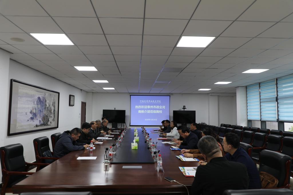 10月30日下午,泰州市政企河南推介团到访我校,开展政、企、校合作交流,双方在新校区行政楼举行校企合作座谈会。河南省机关事务管理局处长孙国印、中国城市发展联盟科创中心主任王天珍和相关领导出席会议。会议由校党委副书记孙建立主持。