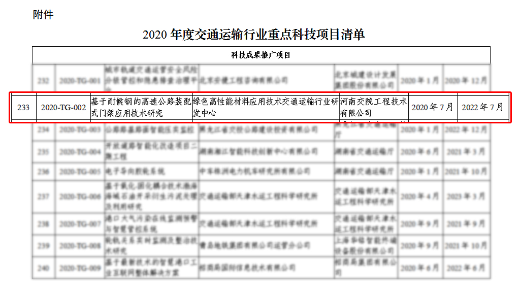 日前,交通运输部发布《交通运输部科技司关于2020年度交通运输行业重点科技项目清单的公示》,由绿色高性能材料应用技术交通运输行业研发中心(河南交院工程技术有限公司)主导的科研项目——《基于耐候钢的高速公路装配式门架应用技术研究》,成功入选“2020年度交通运输行业重点科技项目清单”,是2020年度河南省唯一一个入选的科研项目。