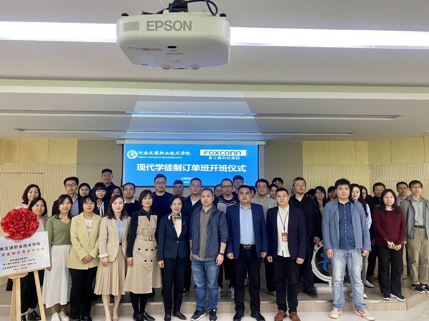 4月28日下午,富士康科技集团“现代学徒制优秀合作院校”授予仪式暨“2021年现代学徒制订单班”开班仪式在交通信息工程系举行。副校长刘芝梅、富士康科技集团人资校企合作专理朱小飞等出席仪式。仪式由交通信息工程系主任田保慧主持,交通信息工程系全体任课教师及订单班学员参加仪式。