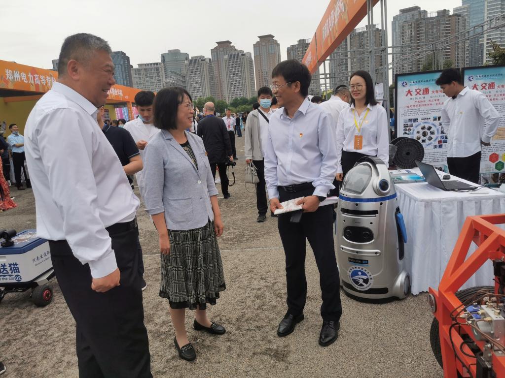 展会现场,我校众多黑科技展品吸引了省教育厅、省农业厅、省总工会等单位与会领导及各方参会人员驻足观看、咨询、体验。曹焱介绍了学生自主研发的物流黑科技产品——L3级自动驾驶实训车,以及河南交院工程技术集团有限公司主导研发的玄武岩纤维等应用成果。