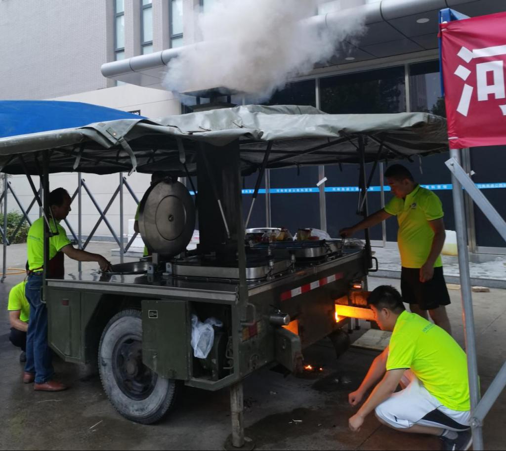 “我们有‘神器’啊。”“对,就是那个‘神器’!”后勤保障组成员不约而同地想到公司户外作业临时用的“移动厨房”——军用移动炊事车。该炊事车不依靠电力,仅用柴油、木柴或木炭做燃料,便可同时供应四个灶台做饭,一小时的烹饪,可以保障600人热食快餐,功能之强,真是重器、神器!