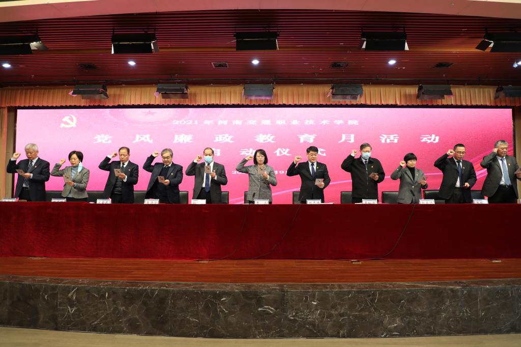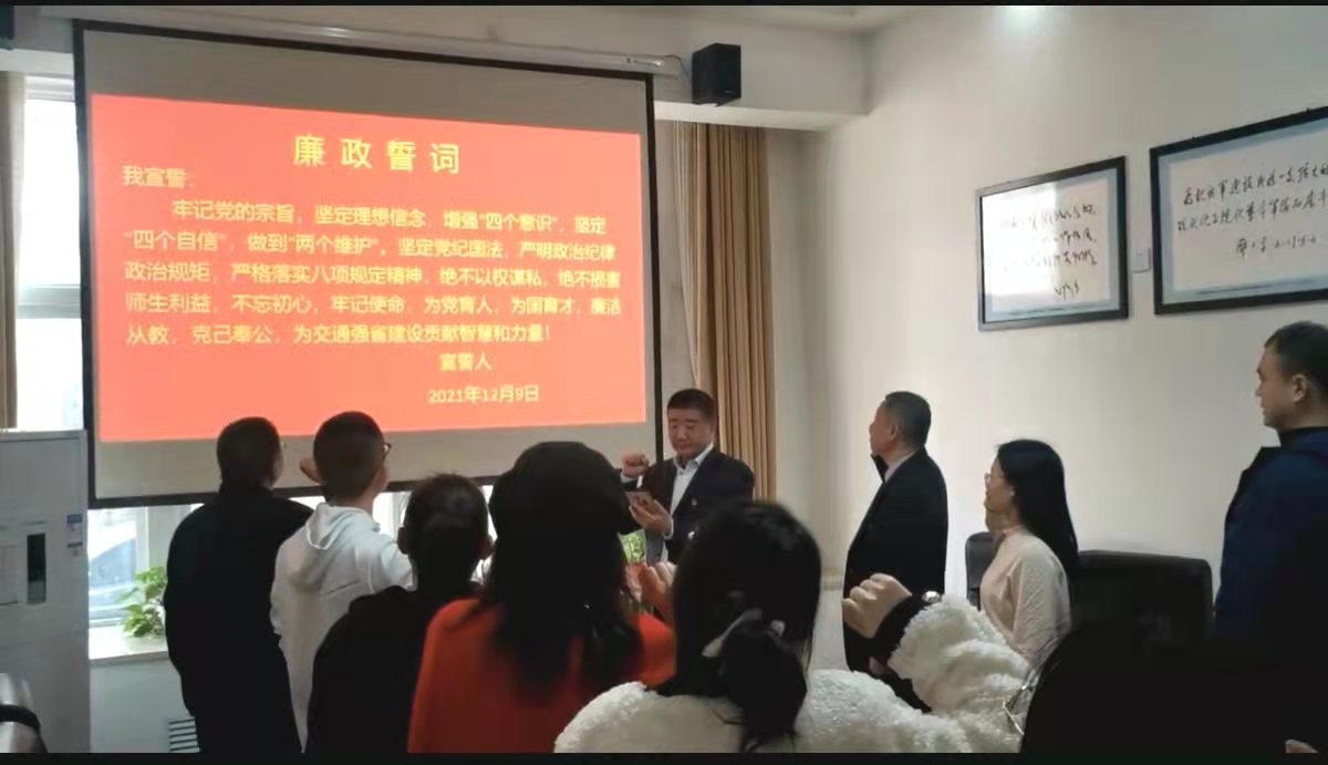 12月9日,学校举行2021年党风廉政教育月活动启动仪式,深入学习贯彻党的十九届六中全会和省第十一次党代会精神,安排部署第8个党风廉政教育月活动,推进廉洁校园建设。校党委书记曹焱以“学百年党史,守廉洁初心,担育人使命,为建设交通强省贡献力量”为主题给党员干部讲授专题党课后,各党总支(支部)主动担当,积极行动,纷纷采取召开动员会议、组织专题学习、开展主题党日活动、举行集体廉政宣誓等方式,扎实开展党风廉政教育,深入推进我校党风廉政建设。