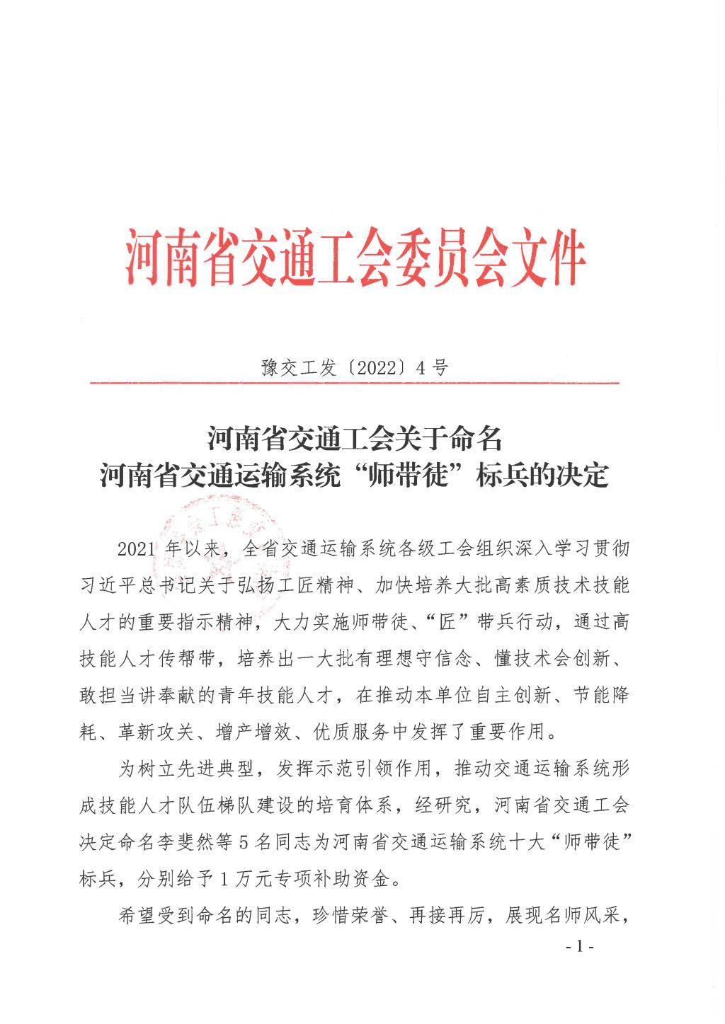 近日,河南省交通工会发布“关于命名河南省交通运输系统‘师带徒’ 标兵的决定”,决定命名5名同志为河南省交通运输系统十大 “师带徒”标兵,分别给予1万元专项补助资金。我校工程技术集团有限公司总经理助理陈红奎荣获河南省交通运输系统“师带徒”标兵荣誉称号。