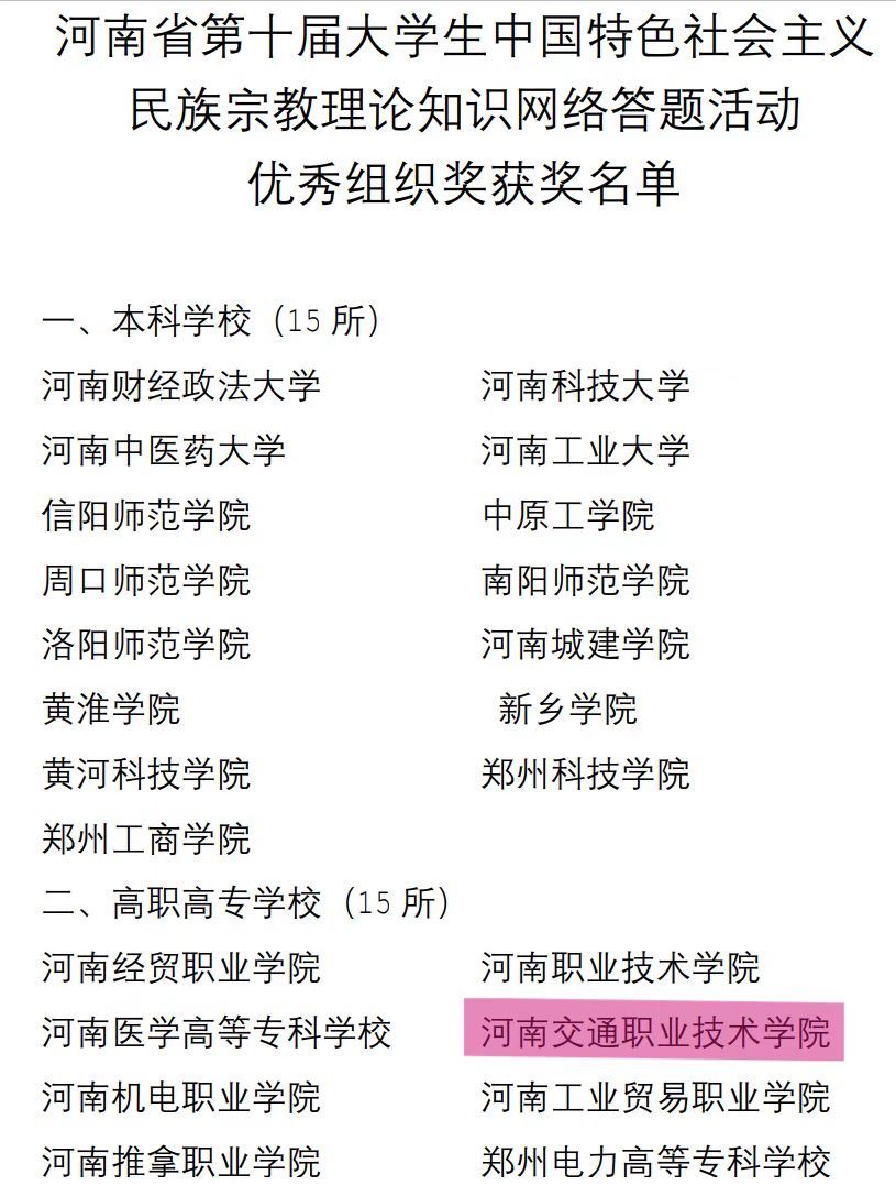近日,省委教育工委、省教育厅发文公布河南省第十届大学生中国特色社会主义民族宗教理论知识网络答题活动比赛结果。我校在活动中表现突出,荣获评“优秀组织奖”, 8名学生获评“优秀选手奖”。