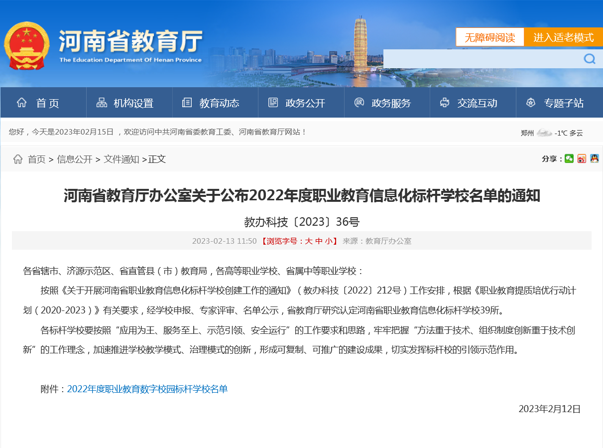 近日,河南省教育厅发布了《河南省教育厅办公室关于公布2022年度职业教育信息化标杆学校名单的通知》(教办科技〔2023〕36号),我校入选河南省职业教育信息化标杆学校。