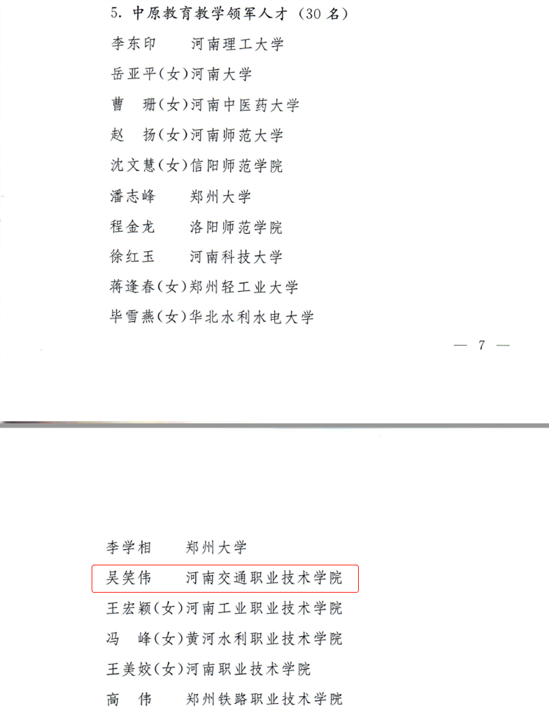 近日,中共河南省委组织部、河南省人力资源和社会保障厅印发《关于印发2022年度“中原英才计划(育才系列)”入选人员名单的通知》(豫组通〔2023〕11号),我校吴笑伟教授入选中原教育教学领军人才(中原教学名师)。